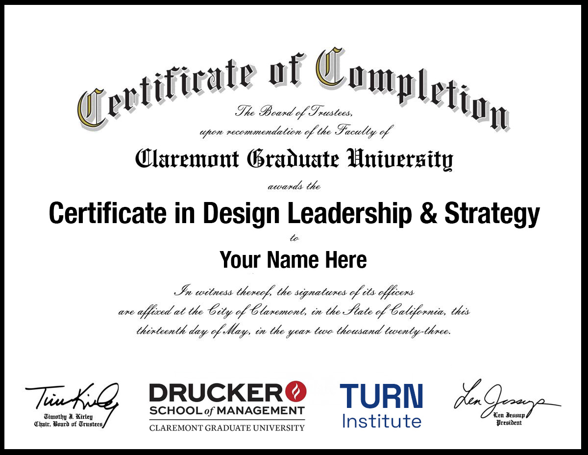 Premiering in February, 2026, the Claremont Graduate University Drucker School of Management and Turn Institute are proud to present a new 12-week Certificate in Design Leadership & Strategy. This program combines the Drucker School's world famous curriculum in management and leadership with Turn Institute's expertise in design leadership, forecasting, and strategy.